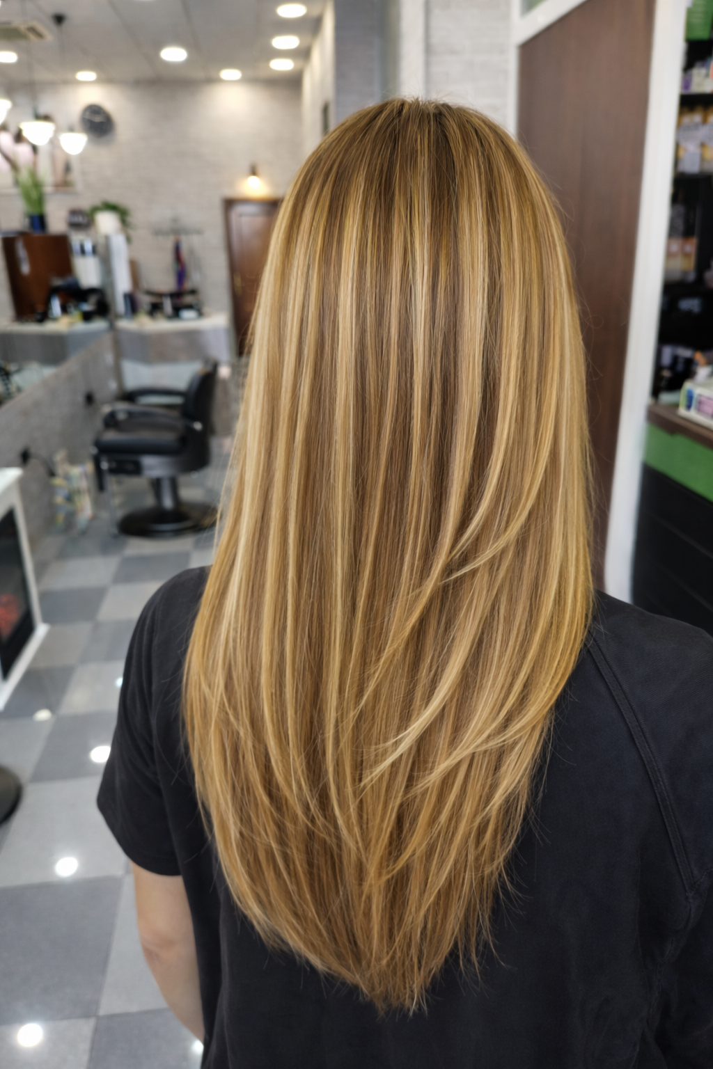 El clásico balayage que resalta la melena XL, creando un degradado perfecto con movimiento y brillo.