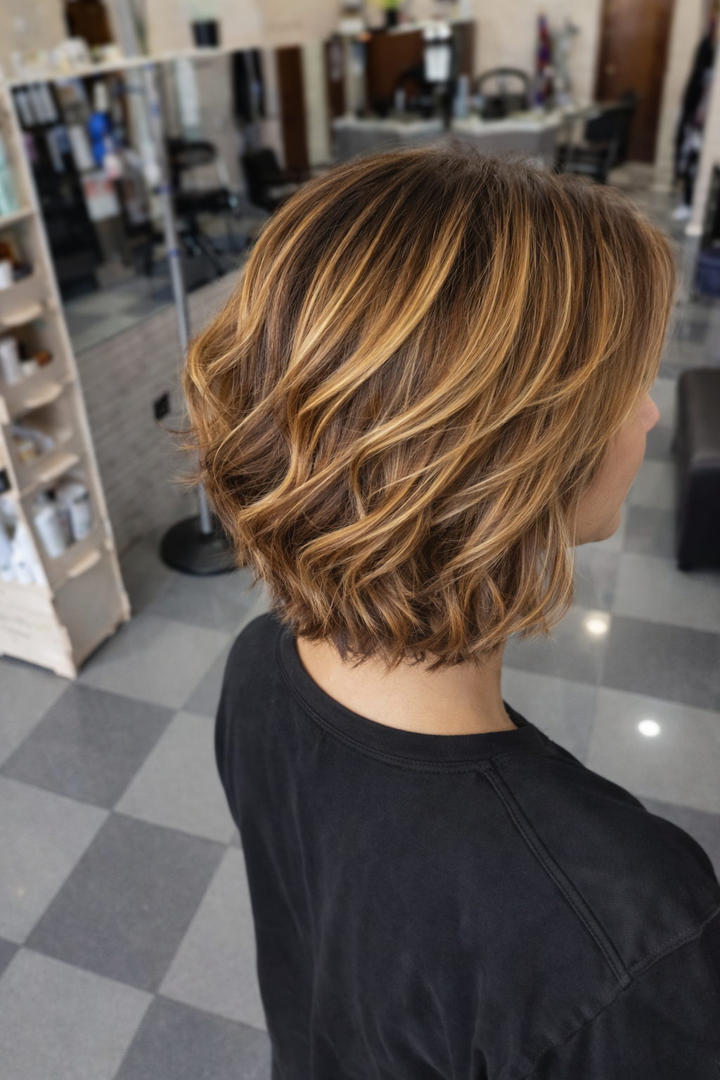 Técnica adaptada para cortes bob, media melena o pixie, dando volumen y textura con un toque de color natural.