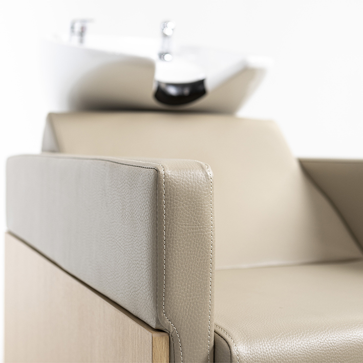 Con un asiento acolchado de líneas rectas y reposabrazos integrados, el lavacabezas RUSTIK está diseñado para garantizar el bienestar del cliente durante el lavado. Su pila cerámica basculante permite ajustar la inclinación para adaptar el flujo del agua y facilitar el trabajo del profesional.